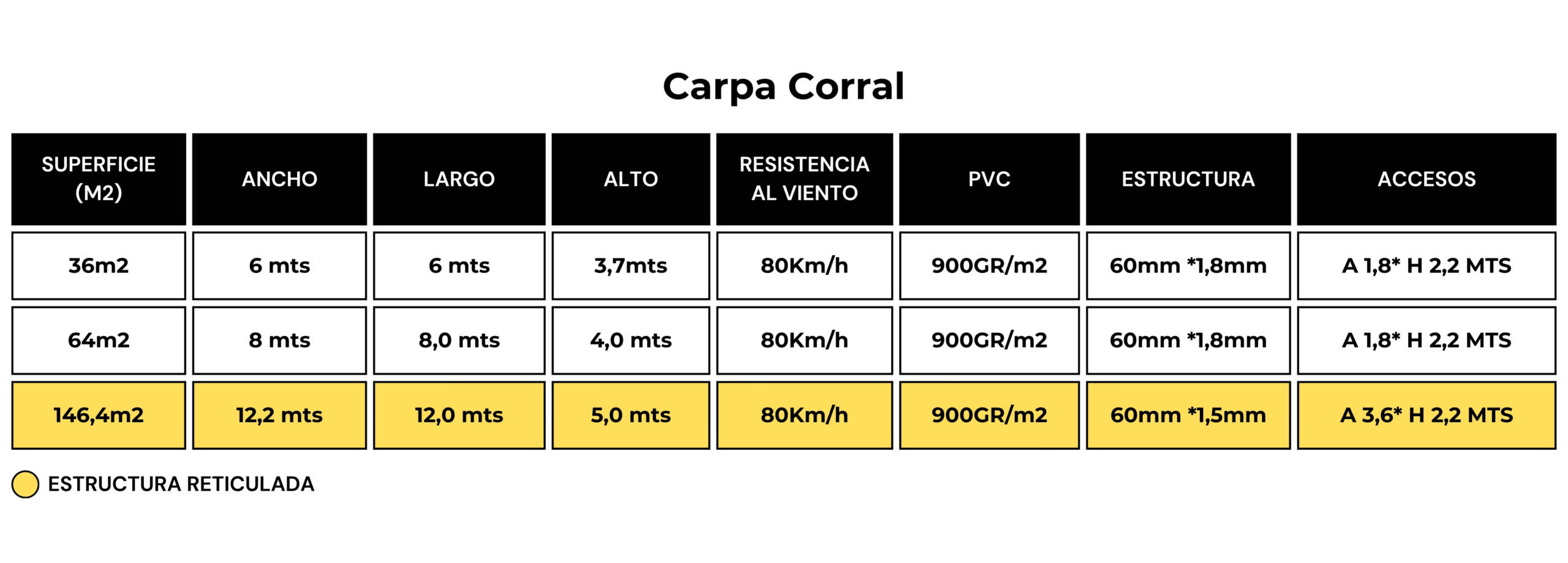 | Tamaño | CORRAL 6 x 6 x 3,7 mts, CORRAL 8 x 8 x 4 mts, CORRAL 12*12*5 mts |