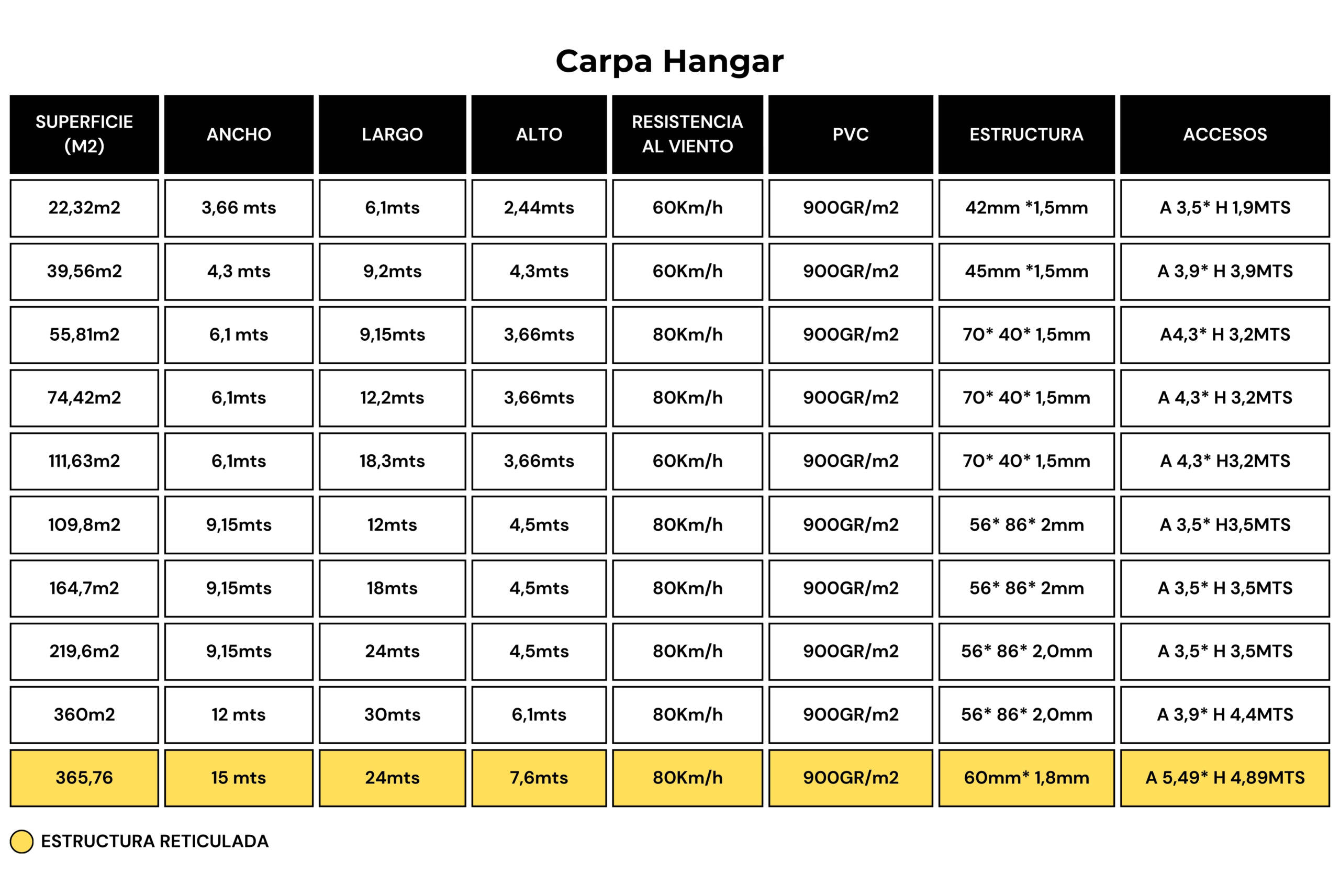 | Tamaño | HANGAR 3,66 x 6,1 x 2,44 mts, HANGAR 4,3 x 9,2 x 4,3 mts, HANGAR 6,1 x 9,15 x 3,66 mts, HANGAR 6,1 x 12,2 x 3,66 mts, HANGAR 6,1 x 18,3 x 3,66 mts, HANGAR 9,15 x 12 x 4,5 mts, HANGAR 9,15 x 18 x 4,5 mts, HANGAR 9,15 x 24 x 4,5 mts, HANGAR 12 x 30 x 6,1 mts, HANGAR 15 x 24 x 7,6 mts |